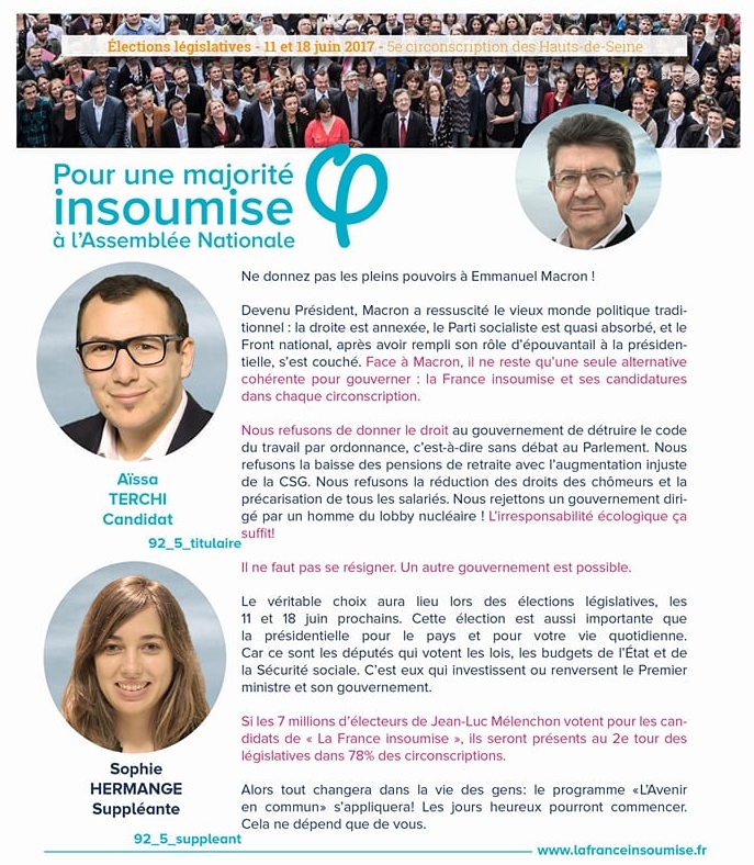 Enfin, Aïssa Terchi a démontré qu’il refuse les vieilles tambouilles politiciennes et les accords sans principes qui ont ruiné le crédit de la gauche ces dernières années. C’est pourquoi c’est avec confiance que je vote pour les candidats de la France insoumise à Clichy et Levallois afin qu’il puisse porter au second tour les idées de progrès mises à mal dans cette circonscription par le député Balkany et ses successeurs candidats.