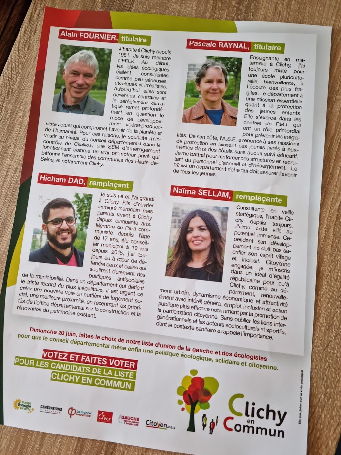 Je me dis que Clichy est d’une certaine façon un peu en avance sur l’agenda démocratique. Bon d’accord, les mêmes – LFI, EELV, PCF, citoyens – qui se retrouvent pour les élections départementales partent sur des listes différentes aux régionales du 20 juin prochain. C’est fâcheux. C’est regrettable car cela ne permet pas la clarification politique nécessaire dans la séquence ouverte par l’élection de Macron. Et pourtant cela ne gâchait pas trop l’air de fête de la distribution de tracts de Clichy en commun. C’était dans les autres camps que l’on faisait la gueule.