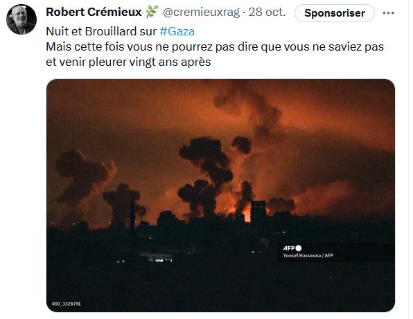 Je suis fatigué d’écrire après une vie professionnelle consacrée à l’écriture. Si je m’y remets aujourd’hui c’est pour répondre à une impérieuse nécessité. Ce qui se passe à Gaza est pour moi une souffrance. J’ai besoin de l’exprimer par des mots. Samedi 28 octobre 2023 cela s’est traduit par un touit sur X. Cela donne la capture d’écran ci-dessous. Je ne sais pas si je continuerai à rendre compte de cette horrible actualité.