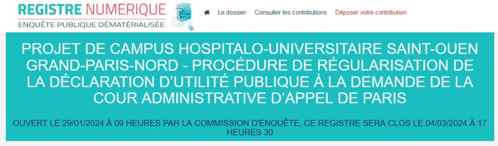 « Par la présente lettre nous vous demandons d’intervenir d’urgence auprès des Préfets de Seine-Saint-Denis et des Hauts-de-Seine pour que l’enquête publique ouverte du 29 janvier au 4 mars à propos du projet de Grand Hôpital Nord à Saint-Ouen face l’objet à Clichy d’une réunion d’information publique organisée par le Commissaire enquêteur.«