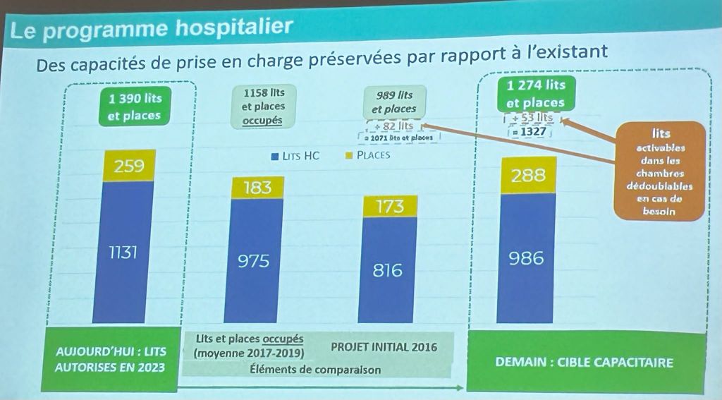 Dans tout le dossier, seul l’aspect médical est traité, sous forme de graphiques manipulateurs pour un projet datant de 2013 et devant se terminer en 2030. Certes en toute hâte l’APHP a rajouté trois études complémentaires bricolées après les décisions des tribunaux de juillet 2023 et octobre 2023, pour redire ce qui est rabâché depuis la décision du Président Hollande, « le projet est désormais définitif ». La question du nombre de lits en moins dans un seul site censé regrouper les capacités de deux (et plus, compte-tenu des hôpitaux plus petits concernés) se résume en des diapositives hors-sol qui font s’étrangler les personnels hospitaliers confrontés à la réalité du terrain.