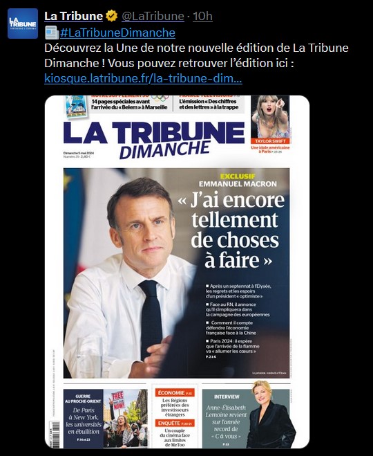 Ce dimanche 5 mai, le journal La Tribune dimanche, acquisition et relance récentes du milliardaire pro-Macron Rodolphe Saadé, titre sur une interview fleuve du Président de la République. La routine politico-médiatique dira-t-on, à laquelle on est habituée. Dans une démocratie en crise, l’habitude pourtant confine à la paresse et la paresse à la complicité. De quoi parle-t-on ?