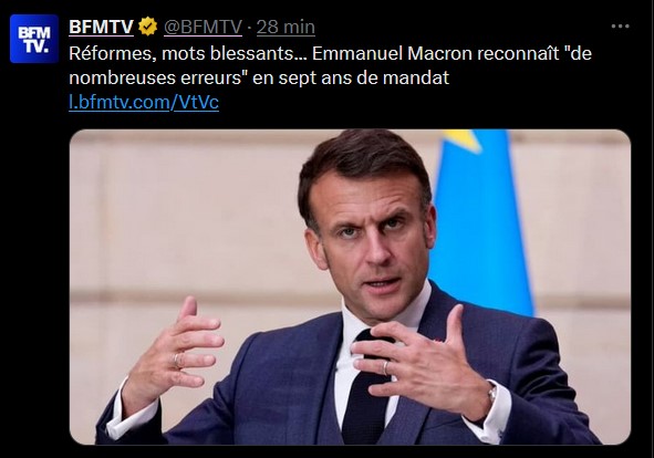 Prenons BFMTV, par exemple. Le média appartenant depuis peu au même milliardaire que La Tribune dimanche, la chaîne infos choisit un angle « informatif » pour parler de l’événement. Si elle se contentait de signaler la parution du journal, cela passerait pour un publi-reportage. L’entretien est donc découpé en « sujets » faisant l’objet d’une relance. Exemple : le chef de l’État reconnaît « de nombreuses erreurs » en sept ans de mandat.