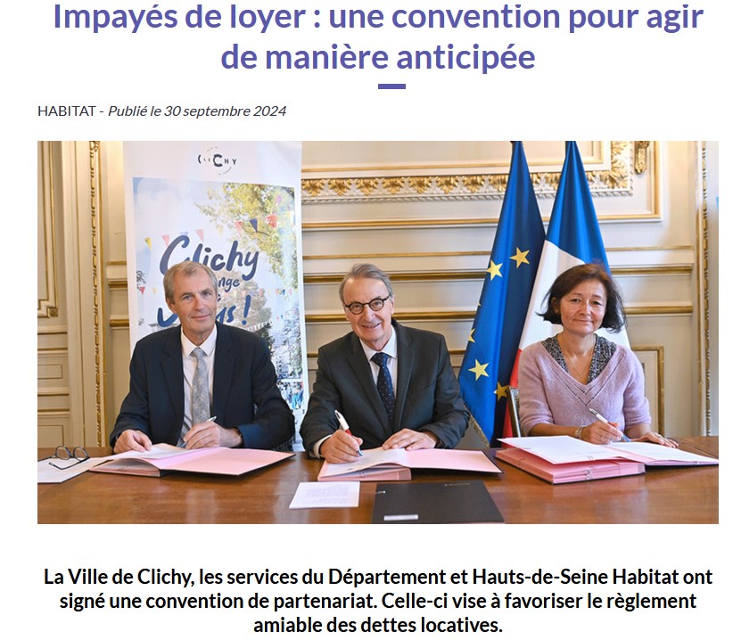 Le site de la municipalité de Clichy a publié ce qui pourrait être une bonne nouvelle pour les locataires clichois en difficulté pour payer leurs loyers. Une convention de partenariat a été signée le 30 septembre dernier entre la Direction de l’Habitat, le CCAS de la ville, la direction des solidarités territoriales des Hauts-de-Seine (le Conseil départemental) et le bailleur HLM Hauts-de-Seine Habitat pour la création d’une Commission locale des impayés de loyer.