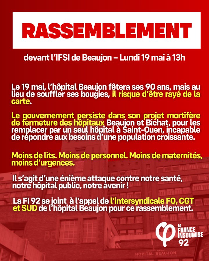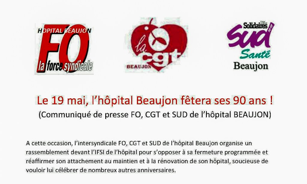 L’intersyndicale FO, CGT et SUD appelle les personnels et la population à un rassemblement pour marquer les 90 ans de l’hôpital (voir l’intégralité du communiqué en fichier joint). Longue vie à Beaujon. Ils auront le soutien des associations et partis du territoire.