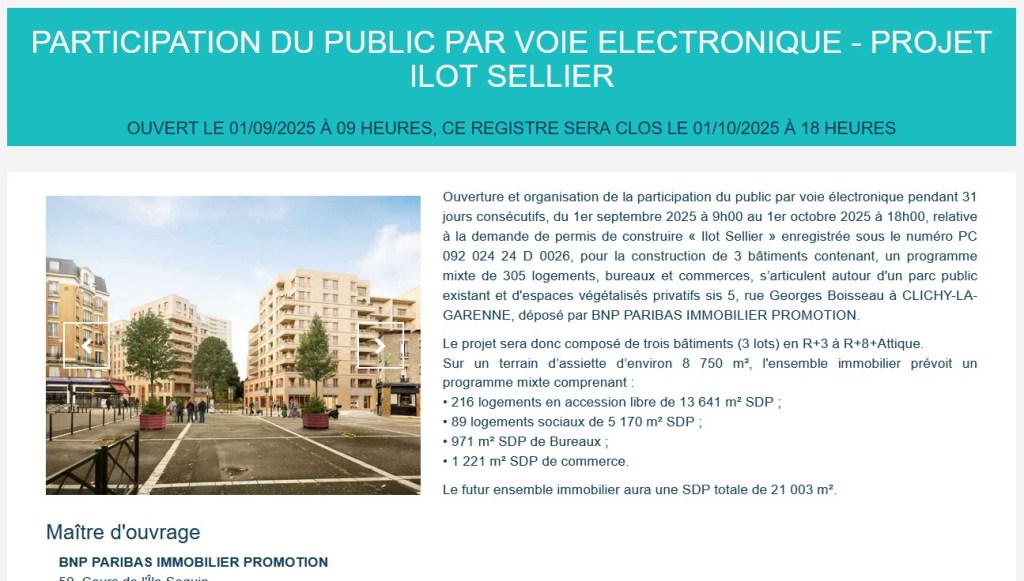 Depuis le 1er septembre 2025, alors que les travaux de démolition de la résidence HLM de Clichy est encore en cours, une enquête publique a été ouverte sur le projet immobilier proposé sur le site. Ce projet, piloté par la banque BNP Paribas, pose de nombreuses questions.